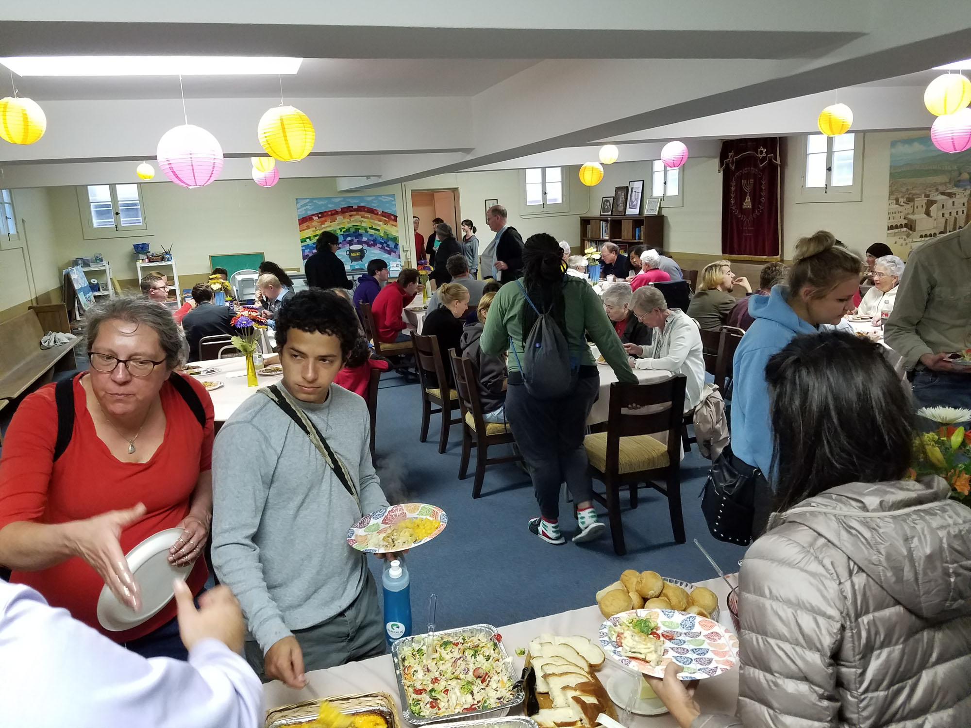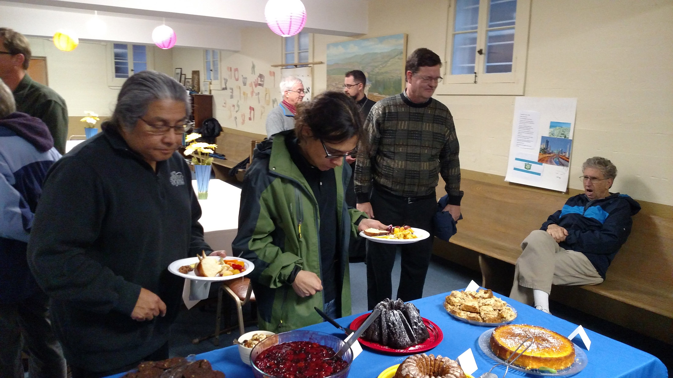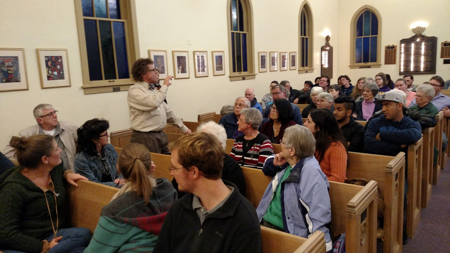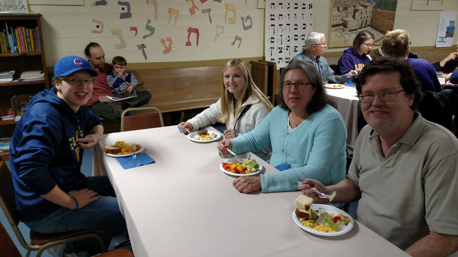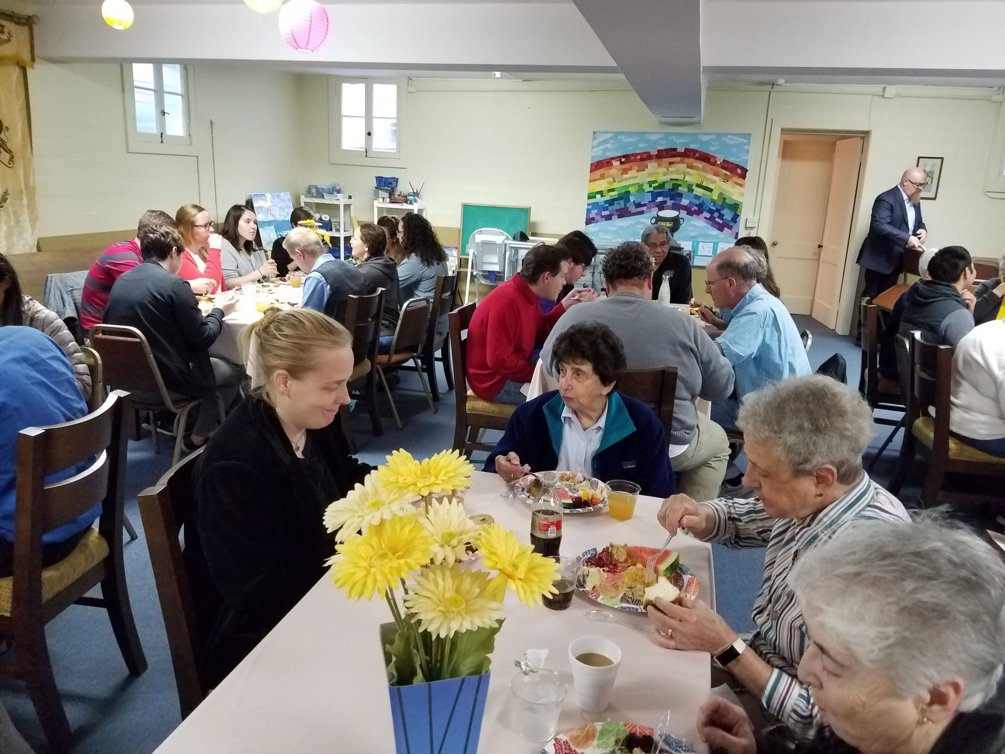 Pictures from our 10-17-19 conversation at Temple Beth El. This was a combination build the Sukkah, service in the Sukkah, dinner in the social hall and conversation. About 90 came for the Sukkah and dinner; 147 were in the Sanctuary for the conversation. Wow. This was a festival of hospitality - CoA folks brought a dish to share in addition to the food prepared by Phyllis Garfield, Ellie Landau and Fern Reinstein. We're not used to seeing our little congregation so packed. Thank you presenters Tauseef Khan, Kerry Brown, Christina Edwards and Kate Scheinman. Topic: Food in your tradition. Participation from a Muslim, Christian/Protestant, Church of Jesus Christ of Latter Day Saints and Jewish perspective.